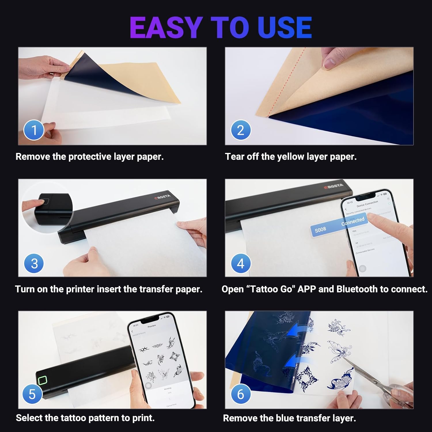 ORGSTA S008 Wireless Tattoo Stencil Printer with 10pcs Transfer Paper, Portable Thermal Tattoo Printer Machine for Artists & Beginners, Compatible with Phone, Tablet, PC