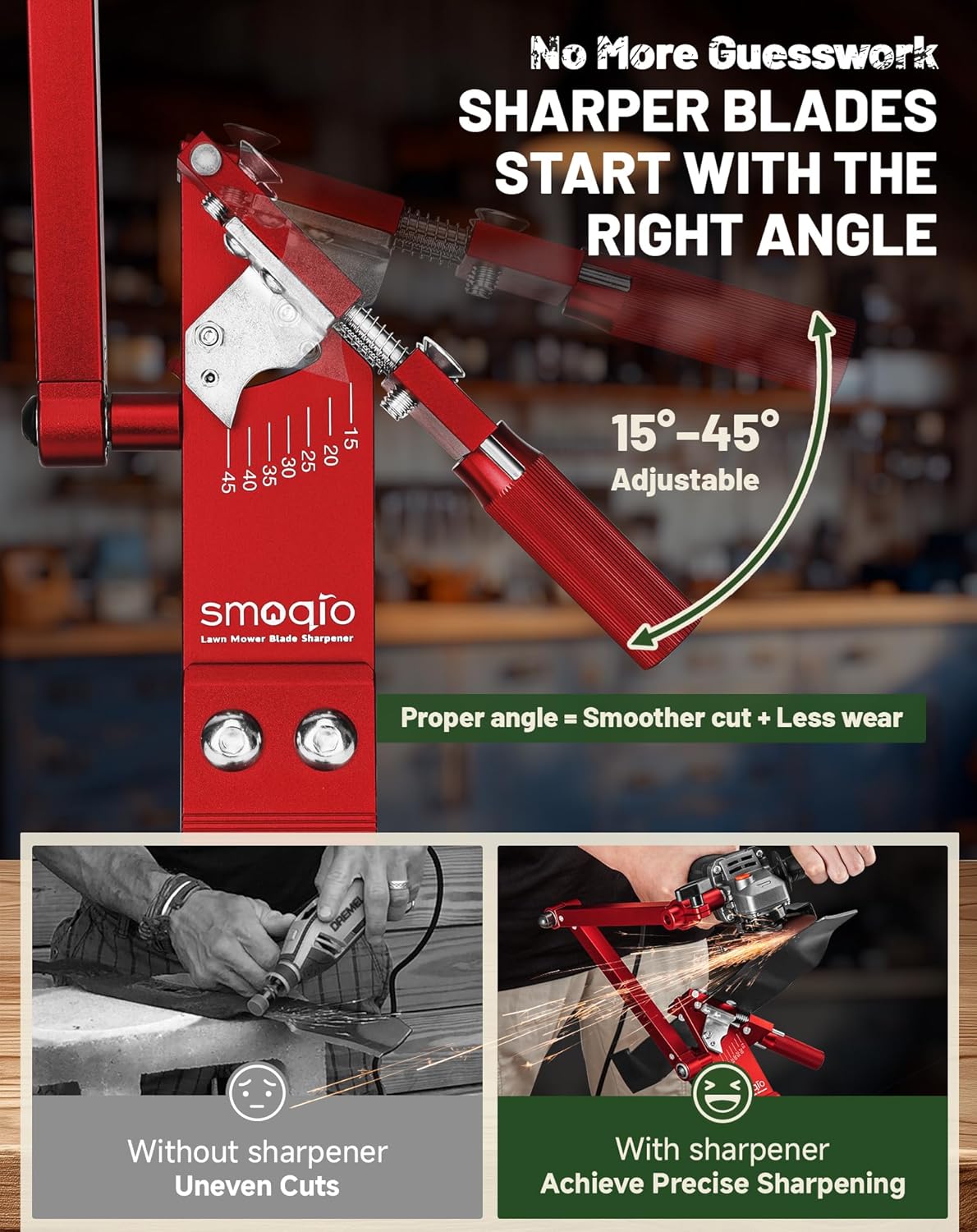 - Precise Sharpening: SMOQIO mower blade sharpener adjusts from 15° to 45°, helping you grind at the right angle. Enjoy sharper blades, smoother mowing, and a healthier lawn.