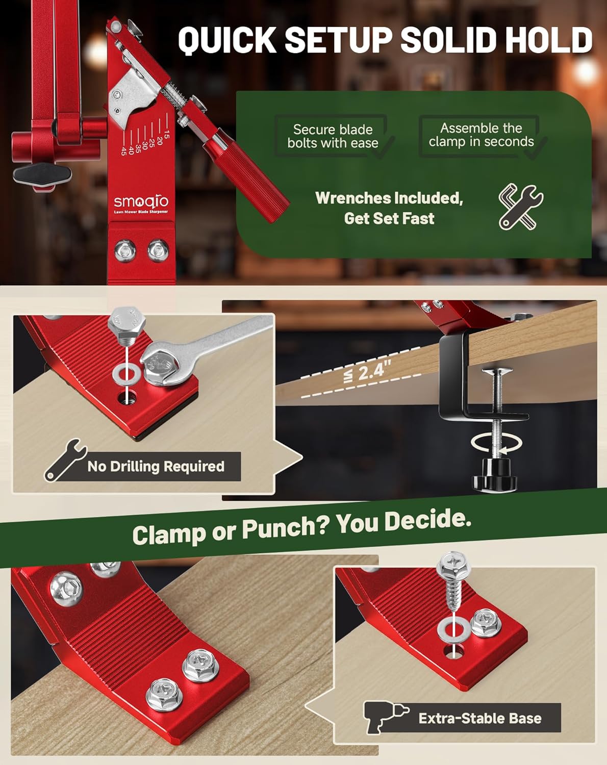 - Dual Mounting Options: SMOQIO lawn mower blade sharpener tool offers two mounting methods—clamp or bolt down. Included wrenches make setup quick and easy, so you can start sharpening right away.